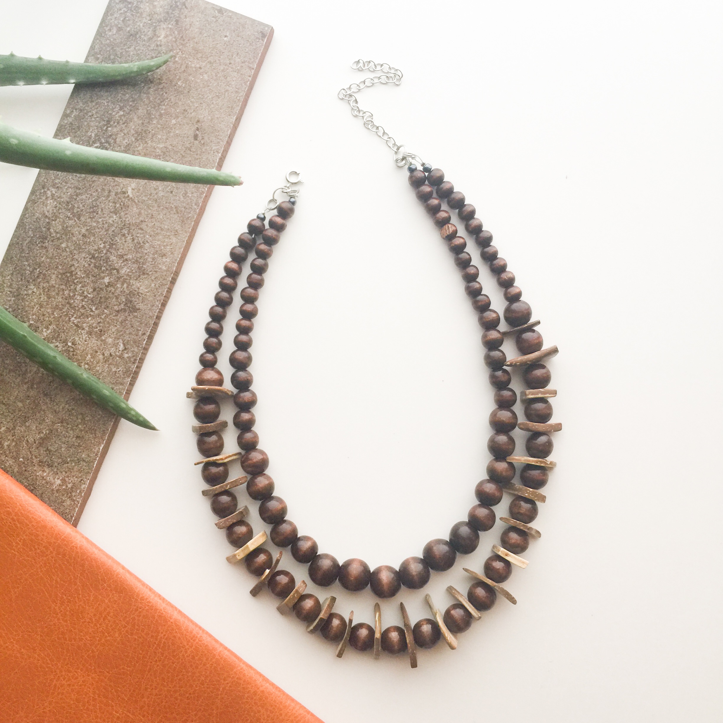 Make a bohemian statement with this 2-tier wood necklace.